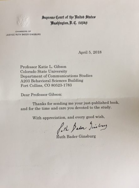 The Organization for the Study of Communication, Language, and Gender has awarded Associate Professor Katie Gibson its 2018 Outstanding Book Award for Ruth Bader Ginsburg’s Legacy of Dissent: Feminist Rhetoric and the Law, published last March. Gibson received the award Saturday, October 6, at the organization’s 41st annual conference held in South Lake Tahoe, Nevada.