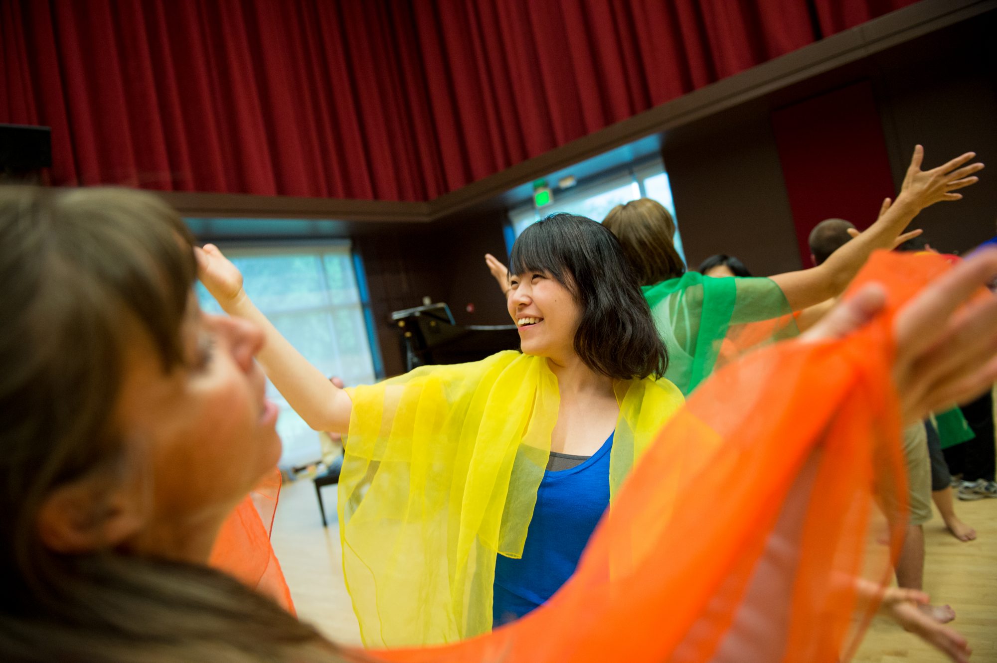 Fritz Anders (male in white t-shirt) Guest Associate Professor in the College of Liberal Arts – Music, Theatre and Dance departments instructs students in Dalcroze Eurhythmics at the University Center for the Arts Colorado State University, August 4, 2015.