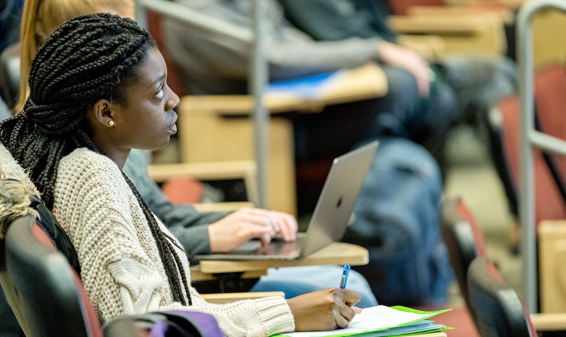 Woman in classroom August 8, 2019 1915 × 1142 Woman in classroom Economics 202, Prof Anders Fremstad in the College of Liberal Arts teaches class, April 30, 2019.